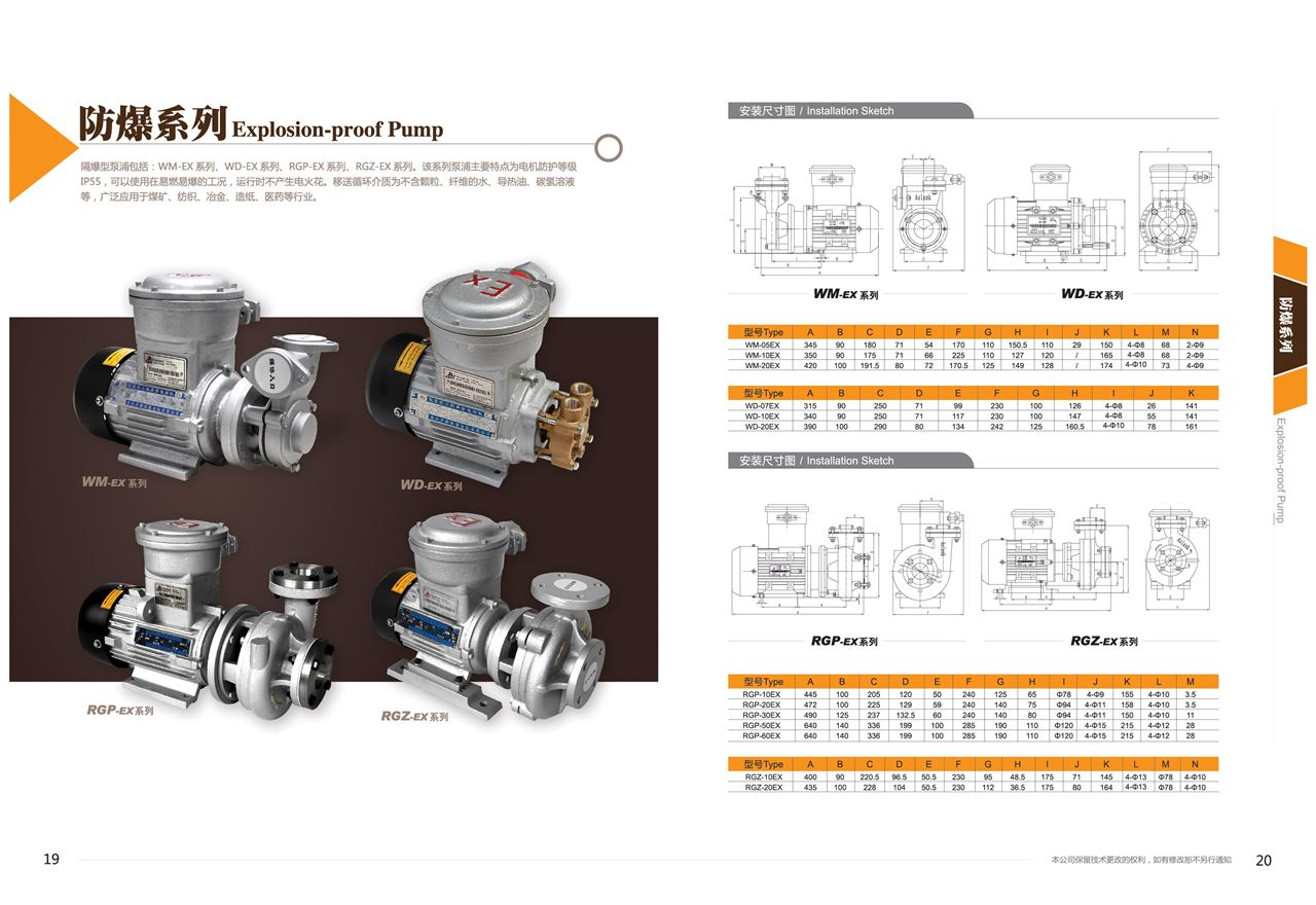 公司产品包括:RGP系列大流量耐高温离心泵、RGZ系列高流速耐高温离心泵、WM系列标准型耐温高旋涡泵、WD系列精致型高扬程耐高温漩涡泵、ISW系列冷水循环泵、WRY系列联轴式高温泵。其中,WM系列、WD系列和WF系列热水泵耐温120℃~150℃,热油泵耐温100℃~200℃;RGP系列和RGZ系列的热水泵耐温120℃~180℃、热油泵耐温200℃~250℃;WRY系列联轴泵zui高耐温350℃。